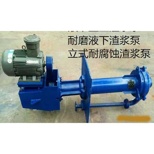 液下渣浆泵入口垂直向下,出口在泵的另一侧垂直向上。泵主要由下滤轮、泵体、叶轮、轴、护板、支架等部件组成,泵上部有轴承支撑;泵安装在液体下,无轴封,过流部件采用耐磨材料。传动类型为BD和DC,即皮带传动和直接连接传动。垂直吸砂泵浸入液体的深度可根据标准尺寸范围内用户的实际需要确定。抽砂前不需要泵。